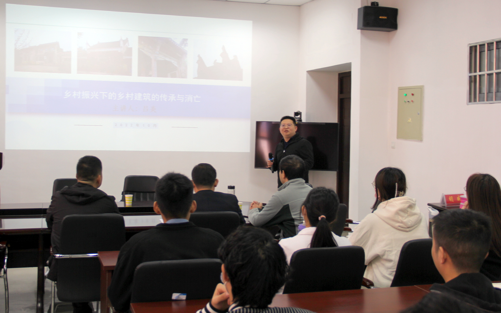 1013日上午,应8827太阳集团官网邀请,信阳市自然资源和规划局吕炎为公司师生作了题为“乡村振兴下的乡村建筑的传承与消亡”的学术报告。8827太阳集团官网经理周葆春教授,副经理肖琪聃副教授、王颂副教授、青年教师吕强和全体研究生参加了此次报告会。