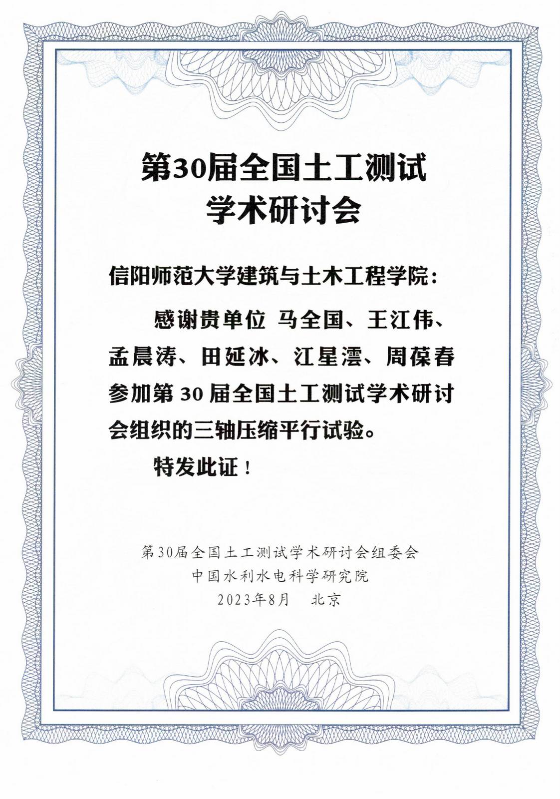第30届全国土工测试学术研讨会于2023年8月18-20日在北京召开。会议由中国土木工程学会土力学及岩土工程分会和中国水利学会岩土力学专业委员会共同主办,中国水利水电科学研究院等14家单位联合承办,多家单位协办和支持。蔡正银、温彦锋等260位专家学者和研究生参会交流。会议邀请了22个特邀报告和65个专题报告,展示土工测试新技术、新方法、新手段和新成果。会议收到111篇论文,发表在岩土工程学报、水利水电技术、水利水运工程学报、水力发电增刊或推荐至正刊。会议筹备期间,组委会组织了细粒土三轴压缩平行试验,得到24家单位的积极响应。